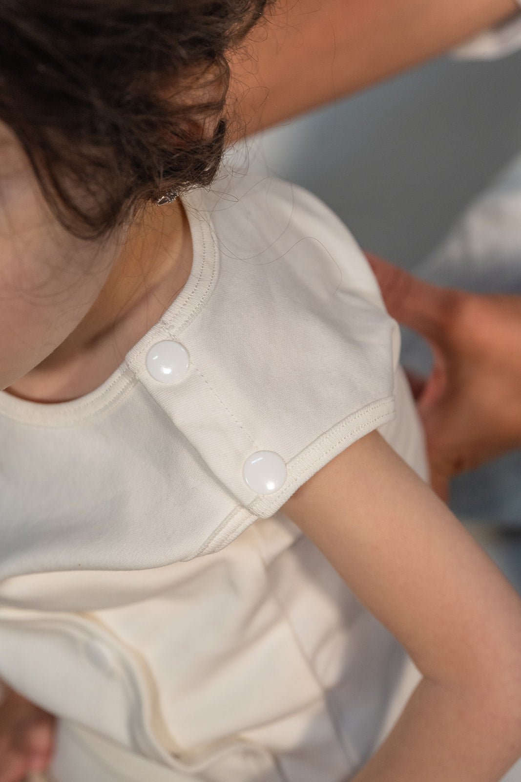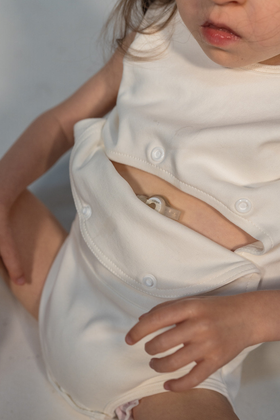 Our adaptive one-piece is thoughtfully designed to accommodate the varying positioning of gastrostomy tubes in children, recognising that each child's needs are unique. Our garments feature a strategically positioned abdominal access opening that ensures seamless access for gastrostomy feeding without compromising comfort or mobility. The flexible design allows for easy adjustment and positioning, making it suitable for every individual body type.
